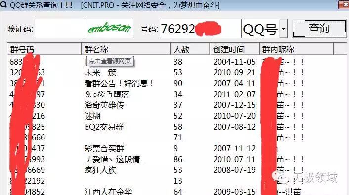 下图是“Q群关系查询” 是腾讯曾经泄露的Q群信息,可以查到目标QQ以前加过哪些群,群内备注都是什么,很大概率能查到真实姓名,以及同学群,这些信息很私密。